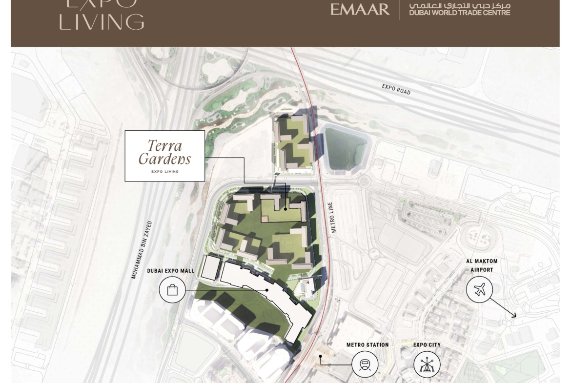 Located in the Expo Valley district of Expo City Dubai, Terra Gardens enjoys a strategic position connected to Sheikh Mohammed Bin Zayed Road and Emirates Road, offering residents seamless access to Downtown Dubai, Dubai Marina, and Dubai International Airport. The area is designed as a car-free, pedestrian-friendly zone, promoting an active, eco-conscious lifestyle with abundant greenery, walking trails, and cycling paths.