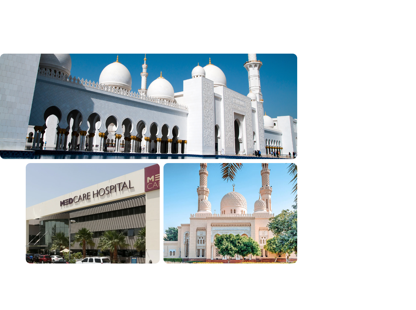 В близлежащих районах расположено несколько крупных культовых сооружений. Известный Мечеть Джумейры, Дом, где находится Центр культурного взаимопонимания шейха Мохаммеда, приблизительно 15 минут езды вдали. Другие мечети, в том числе Мечеть Аль-Гафур, Мечеть Сук Аль Бахар, и Мечеть в Дубай Молле, расположены в соседних Downtown Дубая, все они доступны в пределах 10-15 минут.