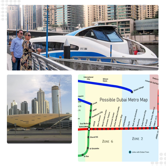 Для тех, кто пользуется общественным транспортом, ближайший Станция метро - Dubai Internet City, просто 5-10 минут от входа на остров. Оказавшись на острове, жители и гости могут путешествовать по нему с помощью такси или монорельсовая дорога на Пальме Джумейра, С нее открывается панорамный вид на ветви и ствол дерева. Монорельсовые поезда курсируют каждые 20 минут, Он соединяет станцию Gateway у основания пальмы с курортом Atlantis The Palm.