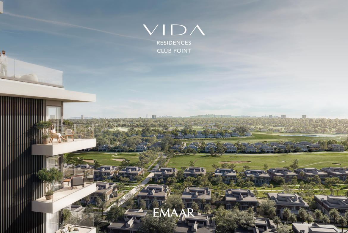 Из окон открывается вид на поле для гольфа Dubai Hills и малоэтажные поселки.