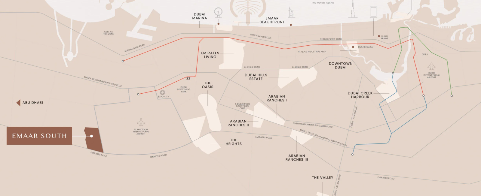 Yaklaşık olarak 1,359 dönüm Dubai Creek boyunca, geliştirme 710.000 metrekarenin üzerinde. kamusal ve perakende alanlara ve çevresine 78,6 milyon sq. ft. yeşil parklar, gezinti yolları, marina ve yat kulübü ile tamamlanan yerleşim alanlarına bağlanmaktadır.